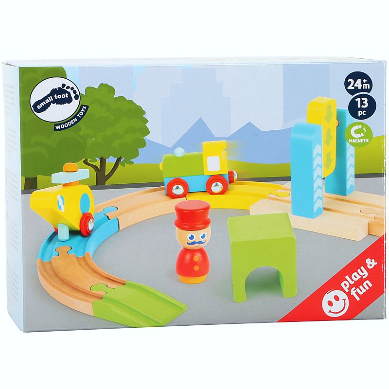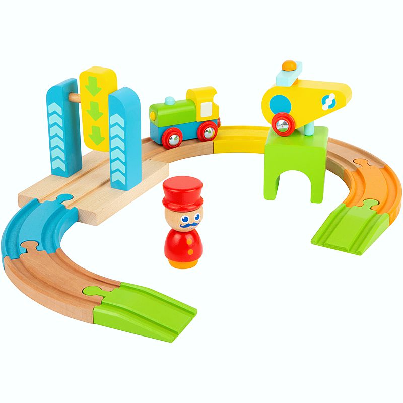 Bunte Holzeisenbahn im 16-teiligen Spielset für kleine Lokführer und Eisenbahner ab 24 Monate. Die Holzeisenbahn besteht aus der Lok, bunten Schienenelementen, einer Lokomotive, Anhänger, Schranke und einem Kran. Kran und Schranke sind durch einen Zahnradmechanismus drehbar und der Kran kann den Waggon nur beladen und entladen, wenn die Schranke den Weg versperrt. Die Schienen sind mit allen handelsüblichen Schienensystemen kombinierbar.Los geht die Reise in ein fantasievolles Spiel. Holzeisenbahn im 16-teiligen Spielset Maße: Eisenbahnschienen aufgebaut ca. 43 x 43 x 15 cm, Lok ca. 6 x 2,5 x 5 cm Material: Holz, Kunststoff, Metall Besondere Eigenschaften: fest verbaute Anhängerkupplung und Kranhaken mit Magnet-Funktion Hersteller: Legler small foot Altersempfehlung: ab 24 Monate Achtung! Dieses Spielzeug enthält Magnete oder magnetische Bestandteile. Magnete, die im menschlichen Körper einander oder einen metallischen Gegenstand anziehen, können schwere oder tödliche Verletzungen verursachen. Ziehen Sie sofort einen Arzt zu Rate, wenn Magnete verschluckt oder eingeatmet wurden.