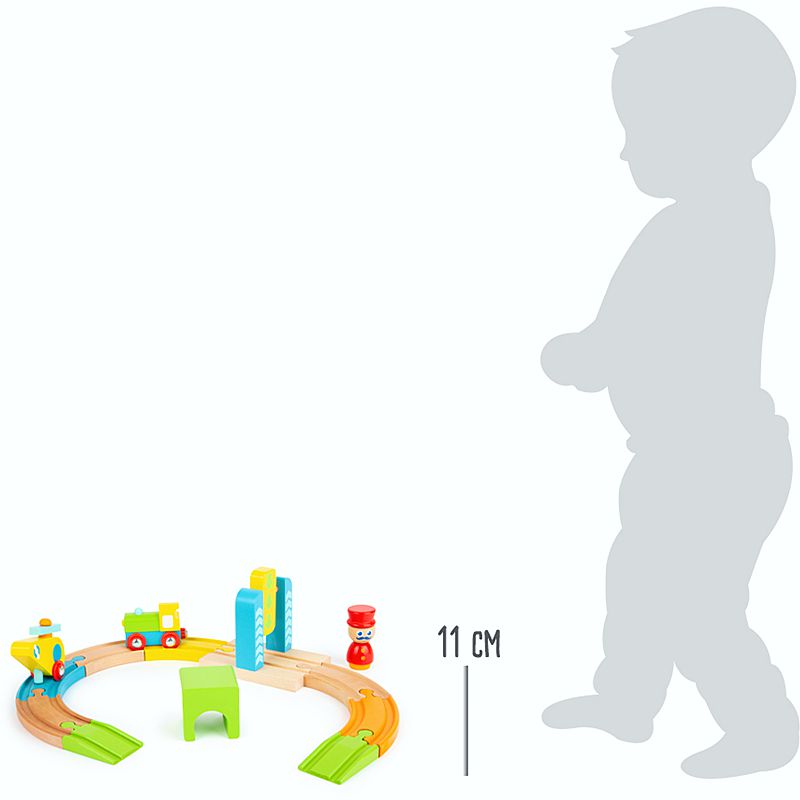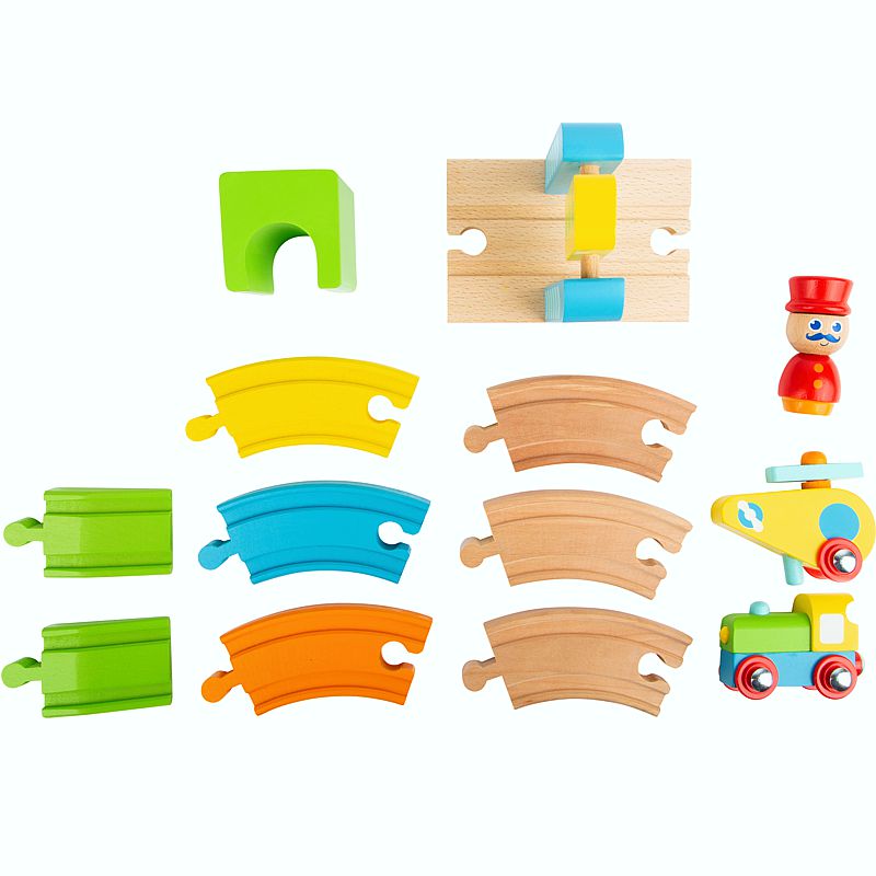 Bunte Holzeisenbahn im 13-teiligen Spielset für kleine Lokführer ab 24 Monate. Die Holzeisenbahn besteht aus der Lok, bunten Schienenelementen, einer Lokomotive und einem Hubschrauber. Der Hubschrauber landet sicher auf der Landefläche und der Schaffner regelt den Zugverkehr. Die Schienen sind mit allen handelsüblichen Schienensystemen kombinierbar. Los geht die Reise in ein fantasievolles Spiel.