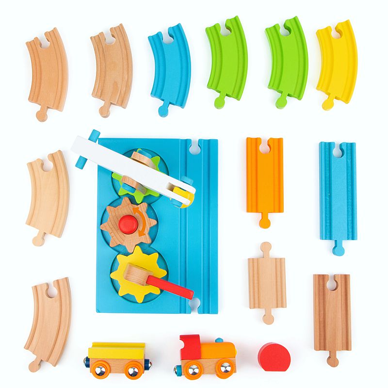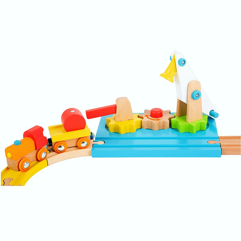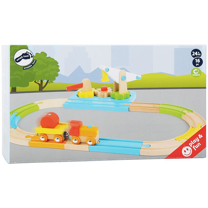 Bunte Holzeisenbahn im 16-teiligen Spielset für kleine Lokführer und Eisenbahner ab 24 Monate. Die Holzeisenbahn besteht aus der Lok, bunten Schienenelementen, einer Lokomotive, Anhänger, Schranke und einem Kran. Kran und Schranke sind durch einen Zahnradmechanismus drehbar und der Kran kann den Waggon nur beladen und entladen, wenn die Schranke den Weg versperrt. Die Schienen sind mit allen handelsüblichen Schienensystemen kombinierbar.Los geht die Reise in ein fantasievolles Spiel.