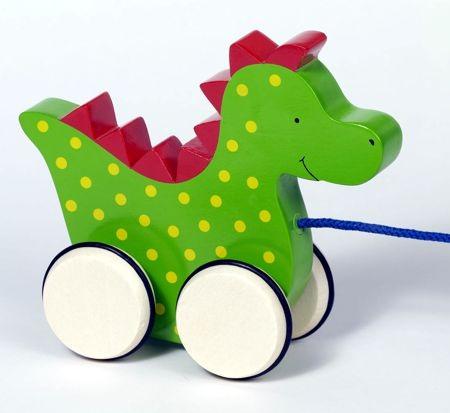 Tolles Holzspielzeug, Ziehtier Drache Saro in kindgerechtem, fröhlichem Design.