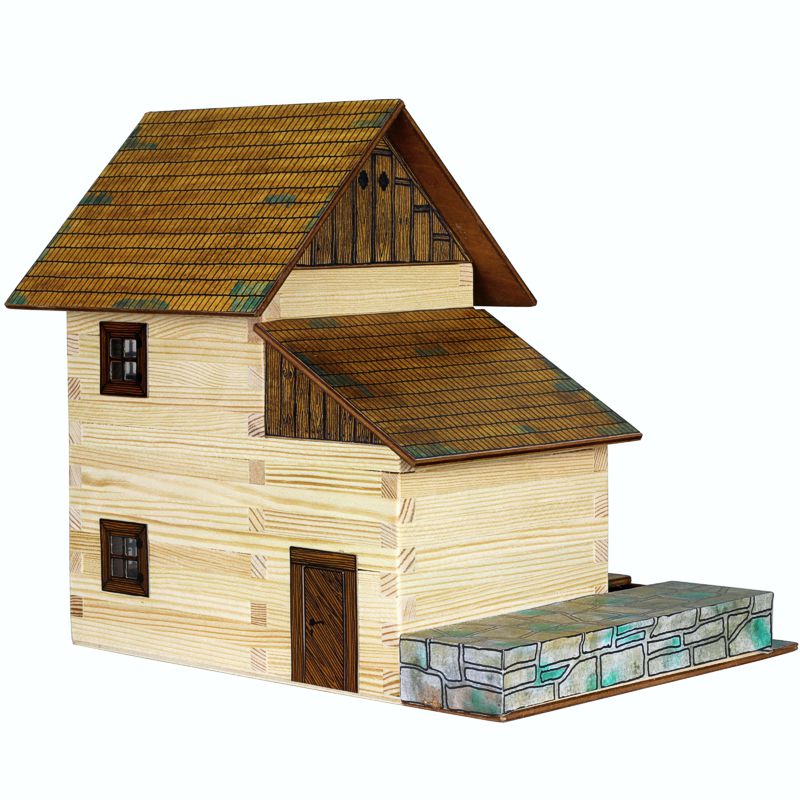 In den WALACHIA Bausätzen finden Sie alles, was Sie zum Zusammenbauen benötigen. Im Baukasteninhalt befinden sich kleine Kanthölzer mit den Querschnitten 9x9 mm mit festen Längen für den Aufbau der Wände. Weiterhin Teile für Giebel und Dächer, Kartonausschnitte mit Fenster- und Türprofilen, Papierdrucke mit Mustern von Giebelflächen, Dächer, Vordächer, Türen, Fenstern, Bodenpflaster sowie Fensterfolien und Schleifpapier für die Feinbearbeitung der Holzteile.