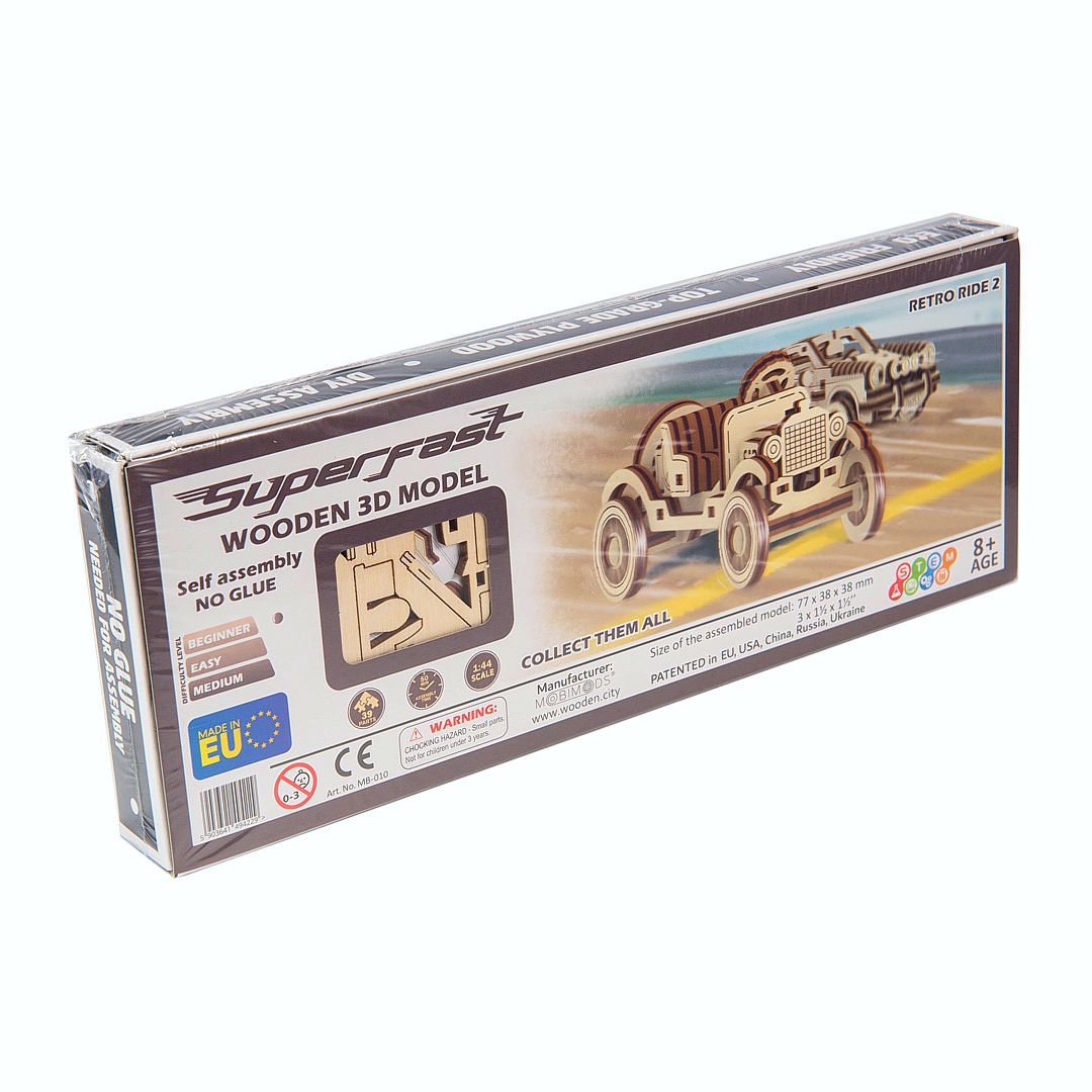 Der Holzbausatz Retro Ride 2, Classic Car wurde dem klassischem Vorbild eines Oldtimers aus vergangenen Zeiten, dem Anfang automobiler Geschichte und Serienproduktion, nachempfunden. Mechanischer 3D Holzbausatz von Wooden City, passgenau aus Birkensperrholz per Laser geschnitten. Der Zusammenbau erfolgt ohne Werkzeug und Klebstoff. Alle Bauteile werden der Anleitung folgend zusammengesteckt. Die Besonderheit der Holzbausätze von Wooden City Superfast sind die beweglichen Teile der Modelle.
