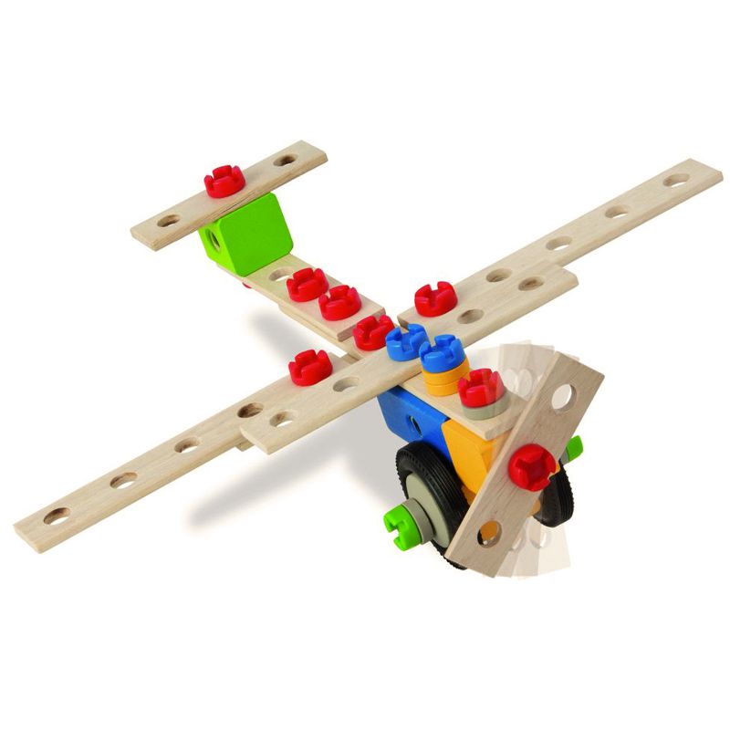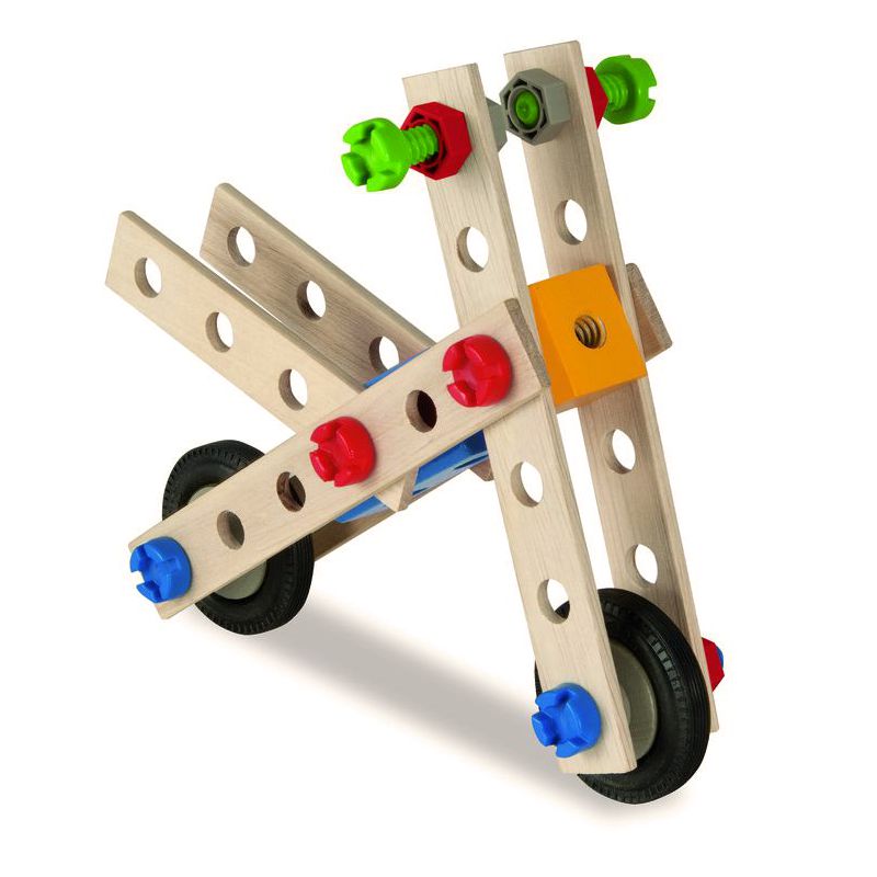 Das 50-teilige Constructor Starterset von Heros ist genau das richtige für kleine Konstrukteure. Es kann ein Flugzeug oder ein Motorrad oder ein Roller zusammengeschraubt werden. Mit den Werkzeugen und der beiliegenden Anleitung werden die Holzteile ganz schnell mit den Schrauben verbunden, der Fantasie sind dabei keine Grenzen gesetzt und es kann jedes mal eine neue Konstruktion entstehen.
