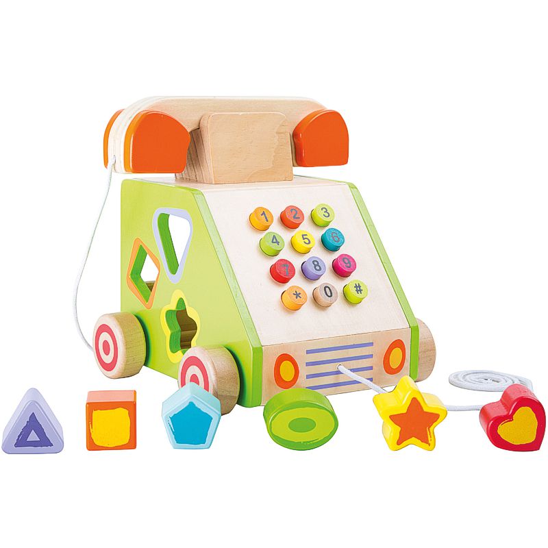 Das fahrbare Telefon ist ein farbenfroher Begleiter auf den ersten Touren durch das Kinderzimmer. Nimm den Hörer vom Telefon, drück die Tasten und rufe an. Wenn du fertig mit dem Telefongespräch bist, kannst du die bunten Steckbausteine in den passenden Öffnungen sortieren. fahrbares buntes Telefon mit 6 Holzsteckelementen Material: Holz, Schnur Textil Maße: ca. 19 x 18 x 19 cm Hersteller: Legler small foot Altersempfehlung: ab 2 Jahre Achtung! Nicht für Kinder unter 18 Monaten geeignet. Lange Schnur/ Lange Kette! Strangulationsgefahr!