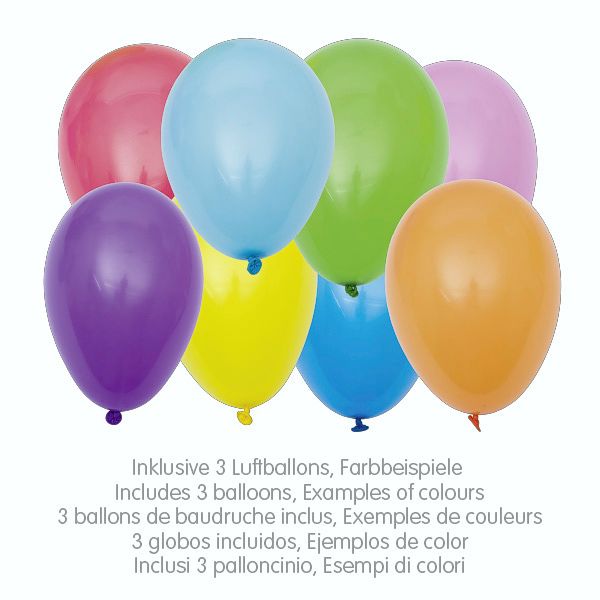 Nicht für Kinder unter 3 Jahre geeignet. Kinder unter acht Jahren können an nicht aufgeblasenen oder geplatzten Ballons ersticken. Die Aufsicht durch Erwachsene ist erforderlich. Geplatzte Ballons sind unverzüglich zu entfernen.